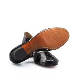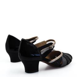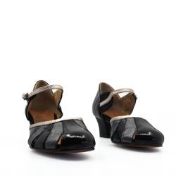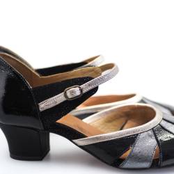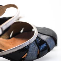 - Upper: Black Bruflex patent leather. Dark gray laminated leather with a polka dot texture. Black velvet side details with shine. Gold laminated trim with a polka dot texture. Chrome-free leather.