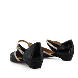 - Upper:Black Bruflex patent leather. Dark gray laminated leather with a polka dot texture. Black velvet side details with shine. Gold laminated trim with a polka dot texture. Chrome-free leather.